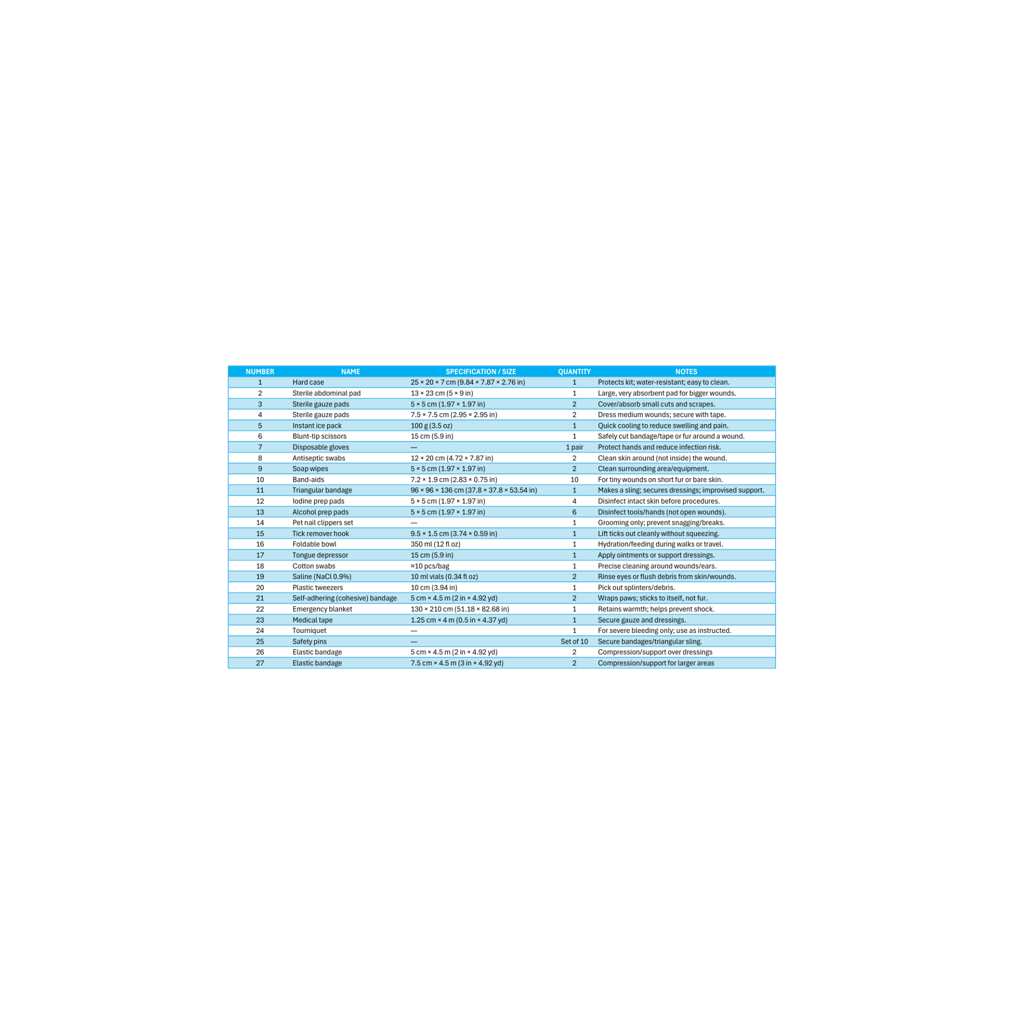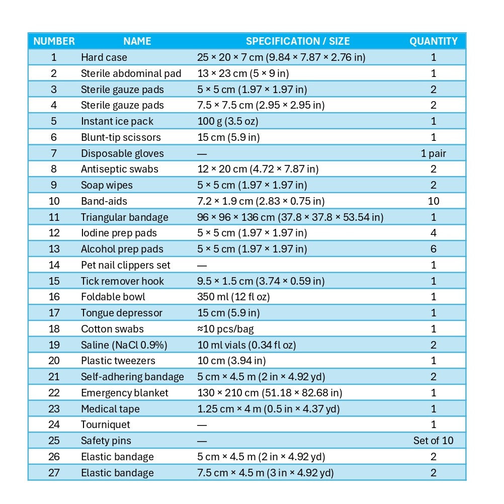 Everything you need for minor incidents—gauze pads, cohesive wrap (sticks to itself, not fur), elastic bandages, medical tape, blunt-tip scissors, gloves, saline, triangular bandage, safety pins, tick hook & more
